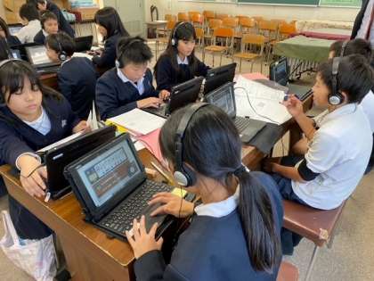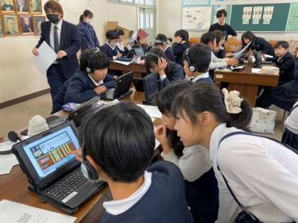子どもたちが、タブレット端末を使い、音階を選びながら「旋律づくり」をしました。