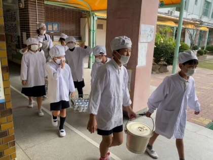 各学級の当番児童が、給食室へ今日の給食を受け取りに来ました。(写真は、5・3・4年生です)