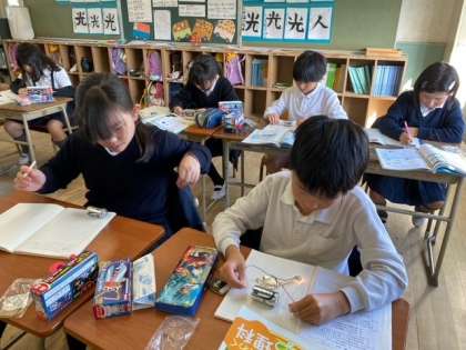 乾電池につないだ「豆電球」がピカッと光りました。