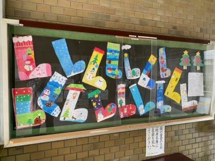玄関掲示は「クリスマス」、3年生の子どもたちがつくりました。