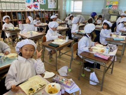 1年生1組の教室では「いただきます」のあと、子どもたちが美味しそうに給食を味わって食べていました。