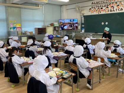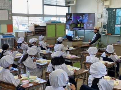 給食の時間に、児童会の動画担当が作成した「右側通行」の動画が流れました。