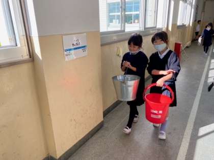 給食後のそうじの時間、早速1年生の子どもたちが右側通行を実践していました。
