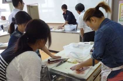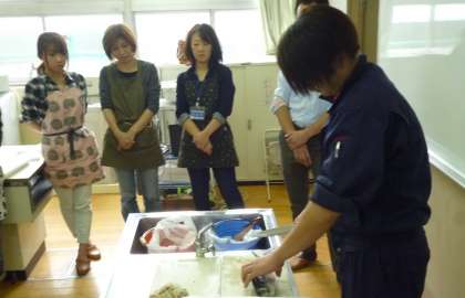 給食を試食した後、東部市場の方に魚のさばき方やおろし方、イワシの手開きを教えていただきました。