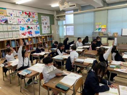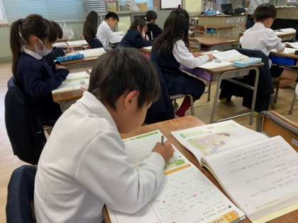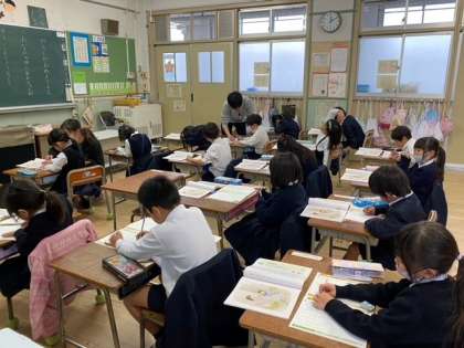 1組の子どもたちが、「わたしが おねえさんよ」の教材を読み、もうすぐ生まれる「あかちゃん」に話しかける言葉を考えました。