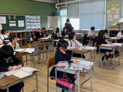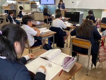 1組の算数科では、「1mを等分した長さの表し方を調べよう」のめあてで、分数を使った表し方を考えていました。