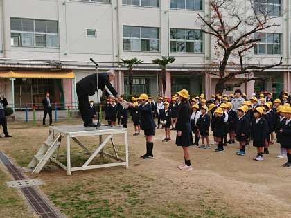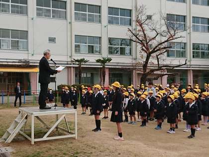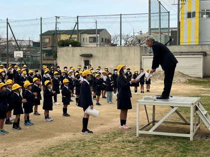 「大阪市防火防災図画」と「大阪市児童絵画版画展」の賞状が、校長先生から2名の児童に授与されました。