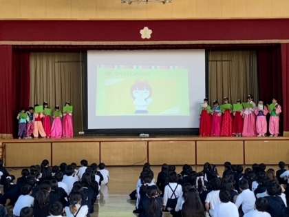 初めに、国際クラブの子どもたちによる活動紹介があり、その後、歌を歌いました。