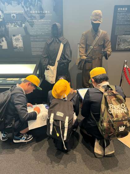 戦時中の服装や、当時を復元した家のようすを見ています。灯火管制も見えますね。