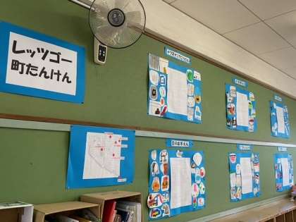 2年生の教室に、「町たんけん」で子どもたちが訪れて見たもの・聞いたことが施設ごとにまとめられています。