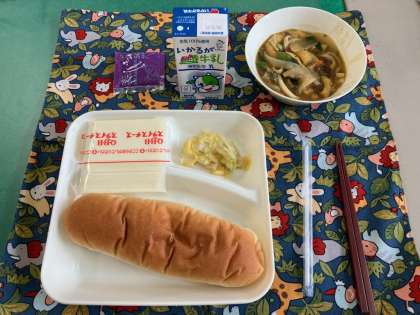 カレーうどん、はくさいのおひたし、スライスチーズ、パン、ブルーベリージャム、牛乳