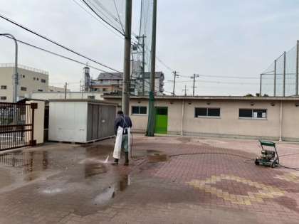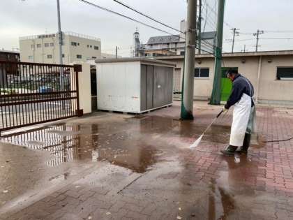 今日は、管理作業員さんが、高圧洗浄機を使って、南門付近の路面の汚れを取ってくれていました。