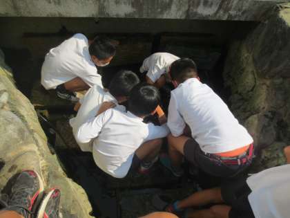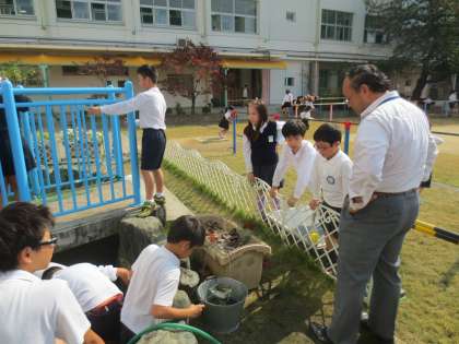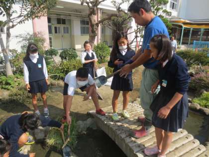 子どもたちは池の水がなくなるまで生き物を網ですくい、保健室裏の池に移してくれました。