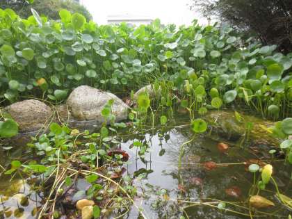 水生植物が生い茂る小川の流れが、水中ポンプの故障で止まりました。小川にはヤゴ、メダカ、ドジョウ、ザリガニなどの生き物がたくさんいます。