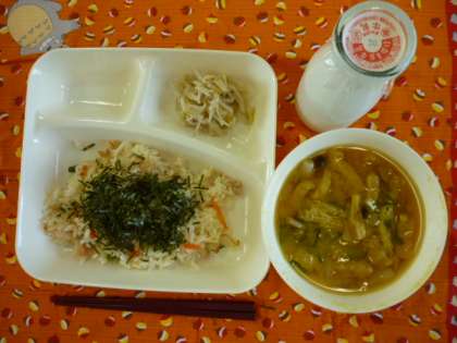 かやくご飯、みそ汁、もやしの甘酢あえ、牛乳