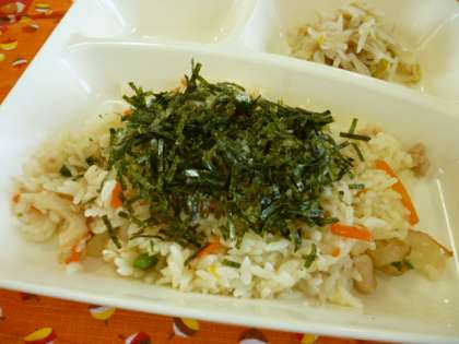 鶏肉、ちくわ、にんじん、三度豆を甘辛く煮こみ、炊き上がったご飯に混ぜます。