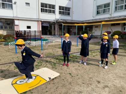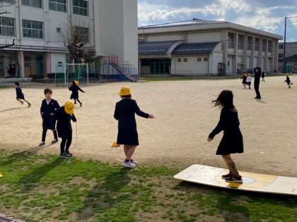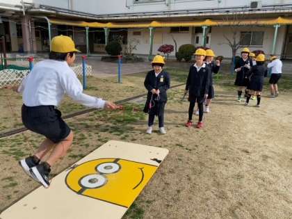 子どもたちが順序良く並んで、順番に跳んでいます。