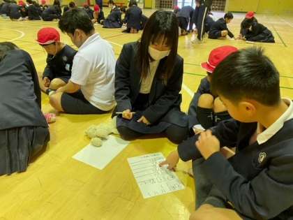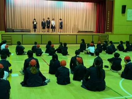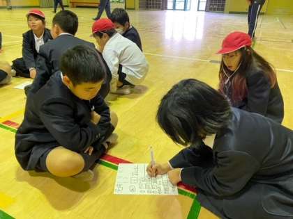 体育館で、集会委員会の子どもたちがルールの説明をしています。数字にかくれている食べ物を見つけるゲームです。