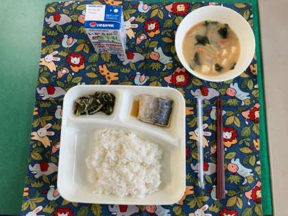 さごしのしょうゆだれかけ、とうふのみそ汁、みずなの煮びたし、牛乳