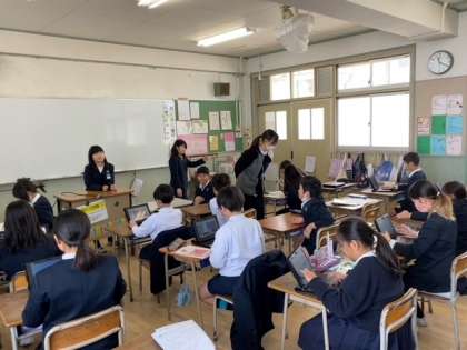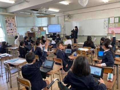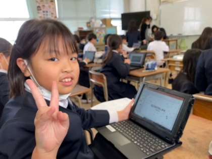 4年生の子どもたちが、総合的な学習の時間に、タブレット端末の「パワーポイント」を使って「自己紹介」のスライドを作成していました。