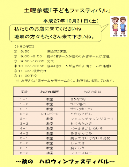 明日10月31日(土) 子どもたちが色々なお店をオープンします。子どもたちは、お店づくりの計画・準備・運営を主体的に考え、話し合い、みんなで協力し、みんなが楽しめる「子どもフェスティバル」に取り組みます。