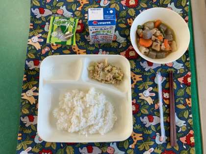 筑前煮、、ツナとキャベツのごまいため、まっ茶大豆、ごはん、牛乳