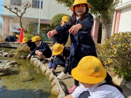 子どもたちが校庭に出て、枯れた葉っぱや冷たい水など「冬」を感じるものを見つけていました。