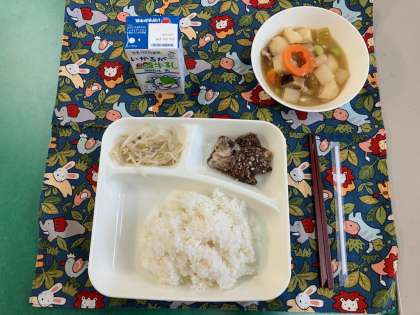 くじらのたつたあげ、まる天と野菜のうま煮、もやしのしょうがづけ、ご飯、牛乳