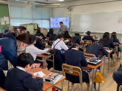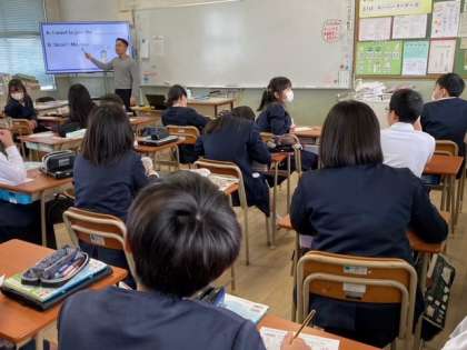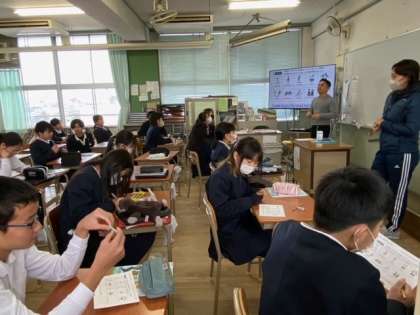 中学校で、自分と同じ部活動に入りたいと思っている友だちや同じ教科を頑張りたいと思っている友だちを絵の中から探し、英語で会話をしました。