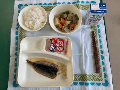 いわしのしょうがじょうゆかけ、含め煮、いり大豆、ご飯、牛乳