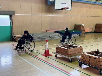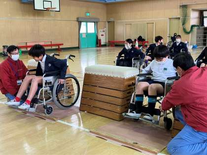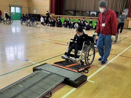 自走体験では、自分一人で車いすを動かしてみると、少しの段差でも 車いすがなかなか前に進まないことがわかりました。