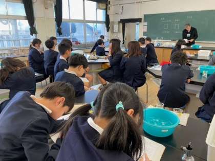 1組の理科は、ミョウバンの水溶液と食塩水を使い、「もののとけ方」の実験をしました。