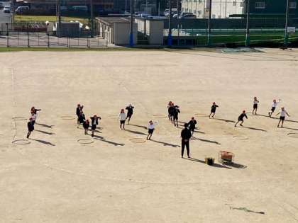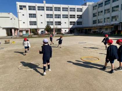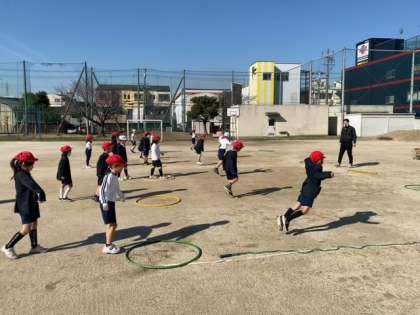 2組の体育科の学習では、子どもたちがジャンプやケンケンなど いろいろな跳び方に挑戦する運動をしていました。
