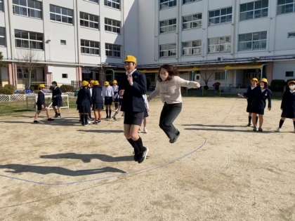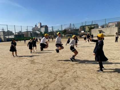 子どもたちと一緒に、担任の先生も軽やかに跳んでいます。