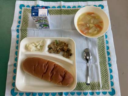 豚肉のカレー風味焼き、コーンとはくさいのスープ、カリフラワーのレモンドレッシング、パン、牛乳