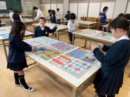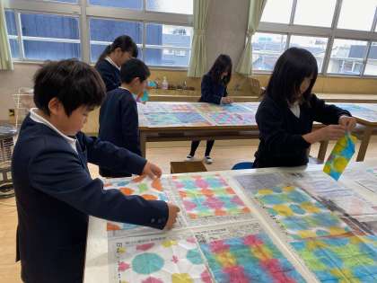 1組の子どもたちが、半紙の折り染めをしました。