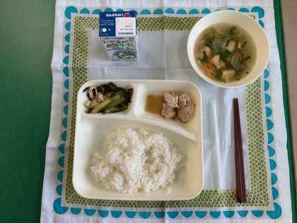 鶏肉のなにわ甘辛ソースかけ、船場汁、こまつなの炊いたん、ご飯、牛乳