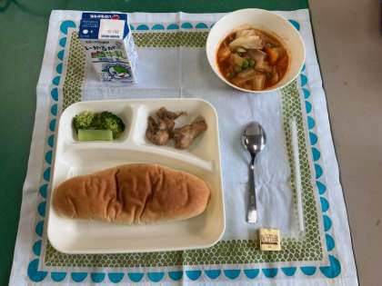 鶏肉のバジル焼き、ウインナーと野菜のケチャップ煮、ブロッコリーのサラダ、パン、バター、牛乳