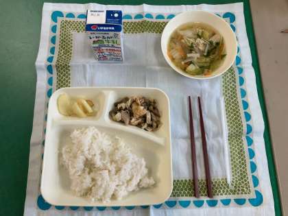 豚肉と干しずいきのみそ煮、すまし汁、あげ焼きじゃが、ご飯、牛乳