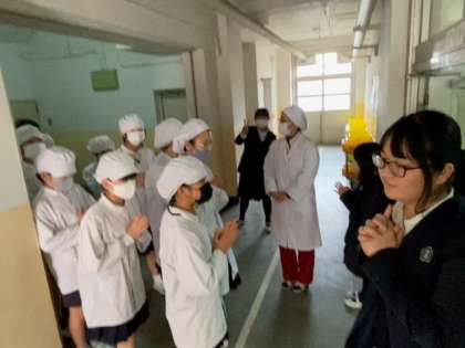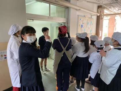 給食当番の児童が、給食の受け取りに来ました。