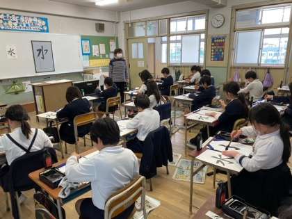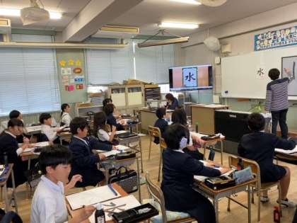 1組の子どもたちが、姿勢を正して、半紙に「水」を書いています。