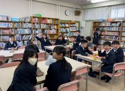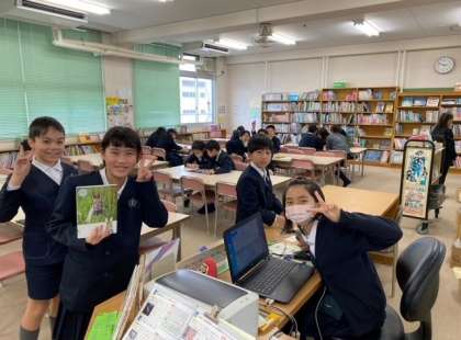 「本」を読む手をちょっと止めて、子どもたちが笑顔を向けてくれました。