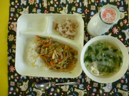 ピリ辛丼、中華スープ、れんこんのオイスターソース焼き、牛乳