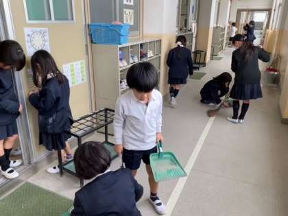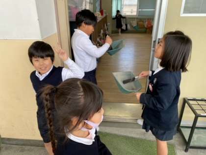 子どもたちが、「ほうき」と「ちりとり」を手に、しっかりとほこりを取っていました。