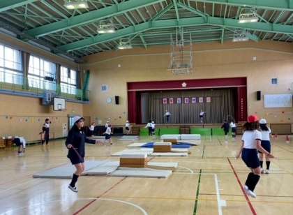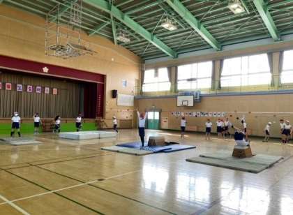 子どもたちが、レベルに応じたやり方で前転の練習をしました。