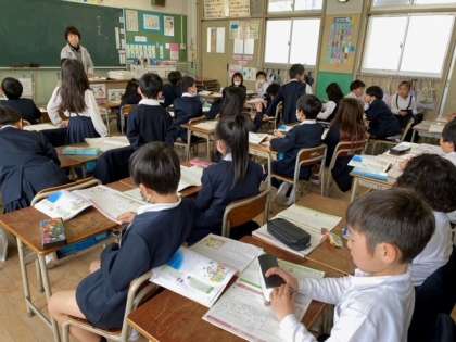 教室の後ろには、子どもたちが、図画工作科で作った「鉛筆立て」が目を引きます。