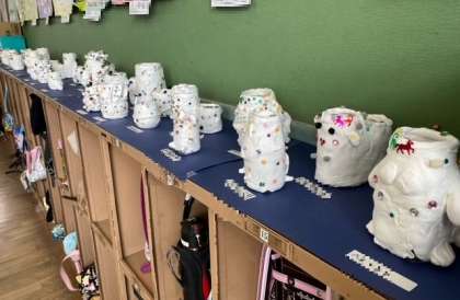 缶やびんに紙粘土を貼り、きれいな装飾を施しました。