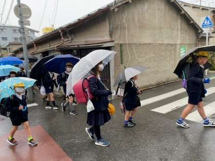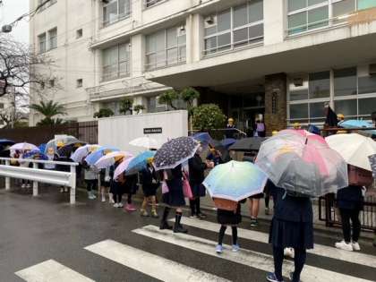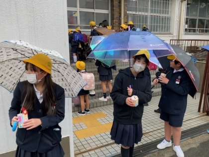 傘をさして子どもたちが登校してきました。
