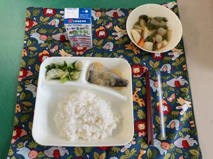 さごしのおろしじょうゆかけ、さといもと野菜の含め煮、なのはなのおひたし、ごはん、牛乳