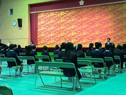 「開式の言葉」、「国歌斉唱」、「市歌斉唱」、「校歌斉唱」、「学事報告」と続きます。